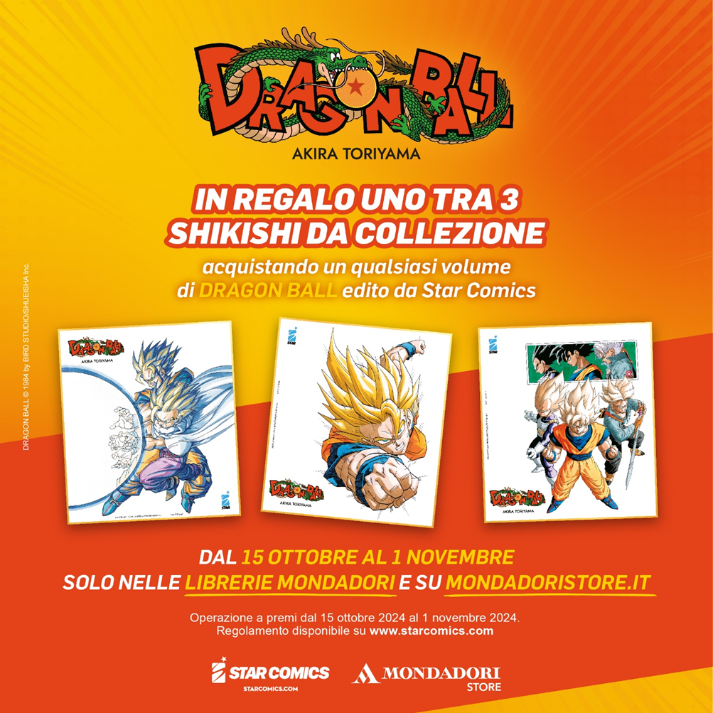 Tre degli shikishi saranno disponibili solo nelle fumetterie aderenti, mentre gli altri tre saranno in esclusiva nelle librerie Mondadori e su mondadoristore.it. In entrambi i casi, sarà possibile ottenere lo shikishi con l’acquisto di un qualsiasi volume legato a DRAGON BALL e edito da Star Comics.