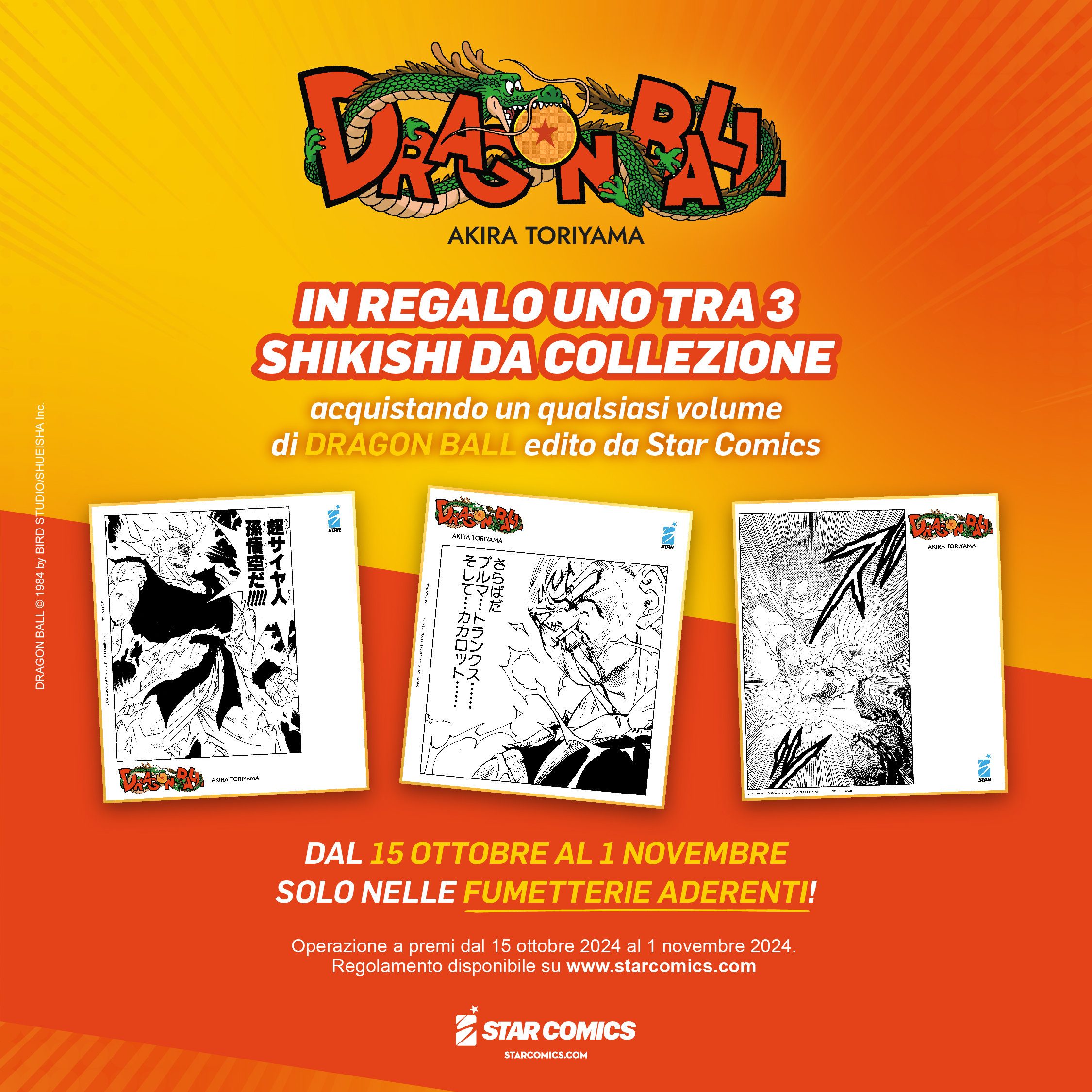 La leggenda delle sfere del drago non ha mai fine! Dal 15 ottobre al 1° novembre, gli appassionati di DRAGON BALL avranno la possibilità di collezionare sei shikishi esclusivi dedicati alla serie senza tempo del maestro Akira Toriyama.